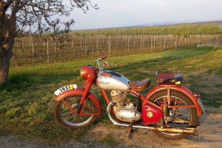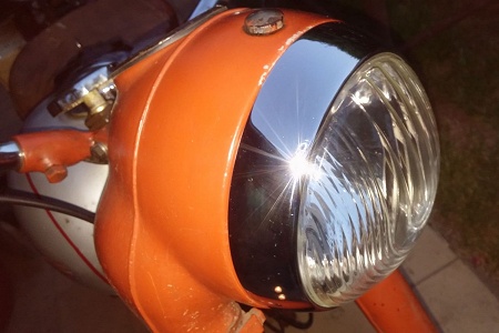 Pro provoz jednoznačně doporučuji si i v případě patinového nálezového stroje nechat za cca 500,- nově hliníkem napařit parabolu. Spolu s 40W žárovkou (její výkon dovoluje 100W VAPE) je to ve výsledku velmi dobrá investice. Ohledně osvětlení, tachometr je osvětlován odrazem zbytkového světla od paraboly. Tedy přes den to nijak nezaznamenáte a v noci vidíte na stupnici něco od 40km po asi 80km…pod a přes nic jiného nevidíte, nebo spíše tušíte. Kontrolka neutrálu je na spínací skříňce a dobíjení vidíte na ampérmetru. Tolik k instalovanému softwaru. Ukazatel zařazených stupňů musíte mít implantovaný ve Vaší hlavě. Přesnost řazení závisí na tom, kolik jste investovali do převodovky peněz (kontrola poškození a výměna hřídelí a koleček, stav řadících vidliček) a času při vymezení. Tím se zamezí hučení, zkrátí se řazení rychlostí a nevypadávají rychlosti. Často to dělá právě třetí rychlostní stupeň. Jistotu provozu exponencionálně navýší vylití nádrže kaučukovou hmotou a instalace palivového filtru na hadičku. Zamezíte tím vlivu benzínu na rezavění nádrže a zanesení palivové soustavy zbytky tohoto procesu. Z praxe ještě doporučuji, nechat na renovovaných nově vypletených kolech po 2000km přecentrovat a dotáhnout dráty (špice). Samotná jízda má úskalí jen pro vysoké jezdce. Posez není nějak extra ukázkově pohodlný. Někdy se stává, že se podvědomě snažíte na sedadle posunout směrem dozadu, což si uvědomíte při zhoupnutí na terénní nerovnosti. Následuje totiž dloubnutí držáku tandemu do Vašich zad. Poloha (její název viz níže) s nohama hodně vzadu je spolu s pokrčenými koleny náročná na zvyk a vyžaduje určitou míru sebemrskačství. Já měřím 181cm a někdy je opravdu nutné už zastavit a nohy narovnat. Velmi pomůžou revmaplechy! Omezí se průvan a jeho působení na extrémně ohnutá kolena. Montáž tohoto doplňku se opravdu vyplatí. Na 350/18 jsem absolvoval 70km v dešti a od kolenou dolů jsem měl nohy suché! Celkově je jízda jednoduchá, příjemná a mírně adrenalinová.