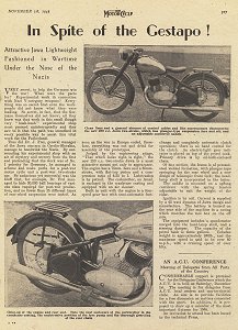 Motocykl Jawa 250 je v článku uveden jako atraktivní lehká Jawa vytvořená během války nacistům pod nosem. Pro západní trhy spadaly Jawy 250 do kategorie Ligthweight, tedy lehkých motocyklů, osazených povětšinou dvoudobými motory. Popisky k fotografiím, známým i z našeho tisku, vyzdvihují zajímavá novátorská řešení, kterými se nová Jawa 250 odlišovala od konvenčně pojatých konkurenčních motocyklů.