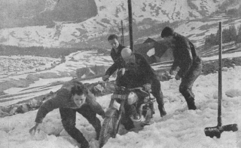 Dobová zpráva uváděla, že čtyři jezdci ATK a dva jezdci Moto-Jawa vyjeli 26. Března na vrchol Sněžky. Na hořejším snímku dva z nich u konečné stanice lanovky na Sněžce. Na dolejším snímku obtížný výjezd u Portašových bud.